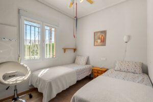 Charming 2 bedroom | 2 bathroom villa with private pool in Ciudad Quesada.  The villa is set over one level and has a living area of 100 m2. It consists of two double bedrooms with fitted wardrobe, a bathroom with bathtub, an open plan kitchen and living room, and a glazed terrace that works as a dining room.  The house is equipped with air condition (hot/cold), fireplace in the living room and double glazed windows.  The house also has a garage with a bathroom. It is accessed by an automatic gate.  Outdoor areaThe villa is set on a south facing corner plot of 504 m2. In the garden you can find a swimming pool, outdoor shower, a shed and a lot of space for outdoor seating areas. There is a small roof terrace above the garage.