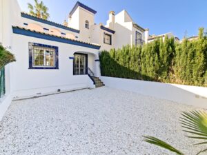 The property is distributed over two floors and features a private front and rear garden, as well as a spacious solarium of approximately 36 m² on the upper level, partially covered, with lighting and a water connection, ideal for enjoying the climate all year round. On the main floor there is a bright living-dining room with fireplace, an open-plan kitchen equipped with cabinetry, granite worktop and appliances, a full bathroom, and two spacious bedrooms with built-in wardrobes. The property is sold fully furnished and ready to move into. It includes split air conditioning in the living room, ceiling fans in the bedrooms and central heating with radiators powered by a gas boiler (currently not connected). Located in a quiet residential complex with well-maintained communal gardens and two pool areas, one of them just in front of the rear garden.The location is excellent, just a 10-minute drive from the beaches of La Zenia and Cabo Roig, and surrounded by golf courses such as Villamartín Golf, Las Ramblas Golf and Real Club de Golf Campoamor. It is also close to shopping areas such as Zenia Boulevard and has good connections to the N-332 and AP-7.