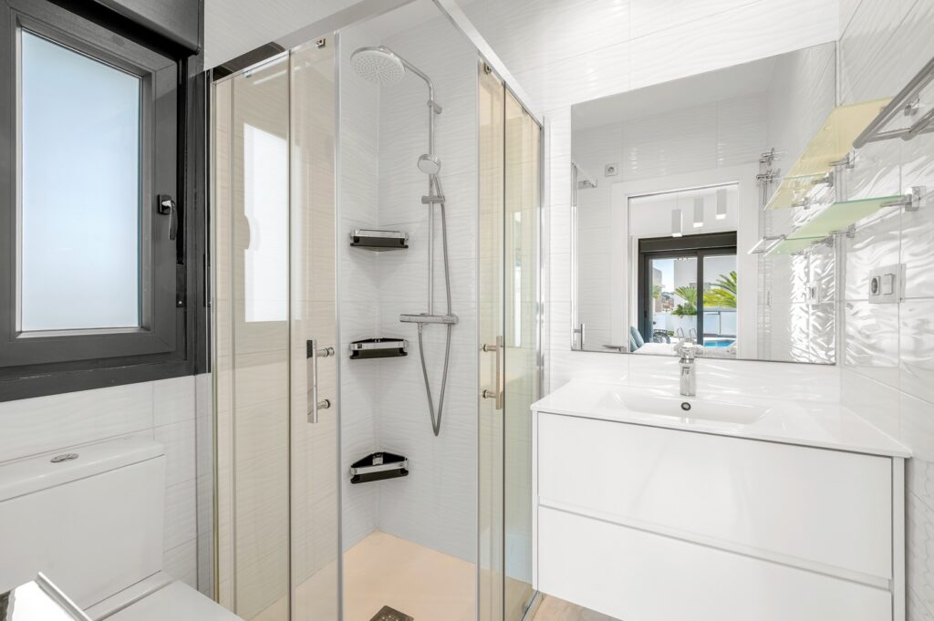 En Villamartín, Orihuela Costa, se encuentra esta moderna villa independiente construida en 2018. Con una superficie construida de 113 m² sobre una generosa parcela de 464 m², la vivienda ofrece un diseño contemporáneo y una distribución funcional pensada para disfrutar al máximo del estilo de vida mediterráneo. La orientación sur garantiza luz natural durante todo el día, aportando calidez y confort a todos los espacios. La villa cuenta con tres amplios dormitorios, todos ellos con armarios empotrados, y dos baños completos, uno de ellos en suite dentro del dormitorio principal. La cocina, de estilo abierto, se integra perfectamente con el comedor y el salón, creando una zona de día luminosa y acogedora, con acceso directo a la terraza y la piscina. También dispone de un práctico cuarto de lavandería independiente. El exterior de la vivienda destaca por su piscina privada rodeada de zonas ajardinadas de fácil mantenimiento, una terraza cubierta ideal para comidas al aire libre, un comedor exterior con pérgola y césped artificial, así como un amplio solárium en la azotea. Además, la propiedad ofrece aparcamiento dentro de la parcela, incluyendo un carport cubierto. Entre sus extras se incluyen aire acondicionado por conductos, paneles solares, una distribución bien pensada y materiales de alta calidad. La vivienda está situada en una zona residencial tranquila pero muy bien conectada, a pocos minutos de campos de golf, centros comerciales como Zenia Boulevard y las mejores playas de Orihuela Costa. Esta villa representa una excelente opción tanto como residencia permanente como para quienes buscan una inversión segura en una de las zonas más demandadas de la Costa Blanca.
