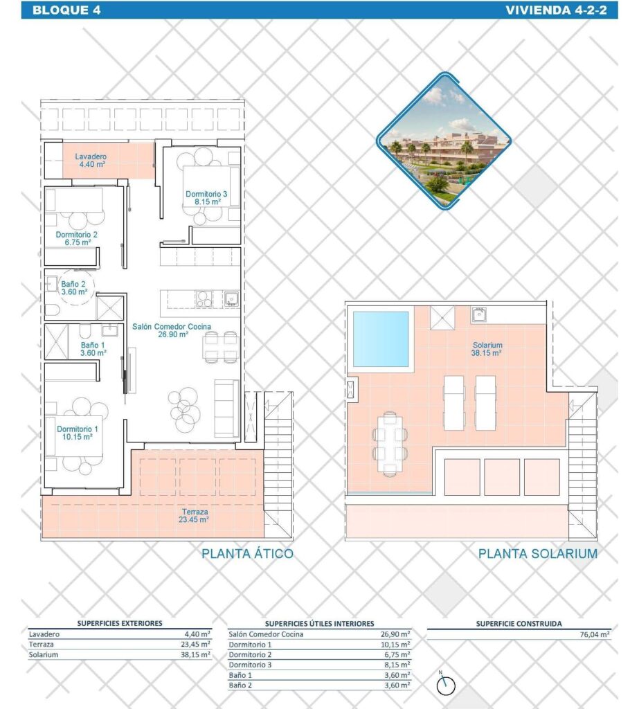 Exclusivo Residencial de Obra Nueva en Pilar de la Horadada, Costa Blanca Viviendas Modernas Cerca del Mar Descubra este nuevo complejo residencial en Pilar de la Horadada, una ubicación privilegiada en la Costa Blanca. A solo 2 km de la playa, este proyecto ofrece una amplia variedad de viviendas de 3 dormitorios y 2 baños, con aparcamiento privado incluido en el precio. El residencial cuenta con amplias zonas comunes, incluyendo una piscina comunitaria, jardines paisajísticos y una zona de juegos infantiles, ideales para el disfrute de toda la familia. Diferentes Tipologías para Adaptarse a su Estilo de Vida Esta promoción ofrece diversas opciones de vivienda: Plantas bajas con jardín privado. Apartamentos en planta intermedia con amplias terrazas. Áticos con solárium privado. Bungalows en planta baja con jardín privado. Bungalows en planta alta con jardín y solárium privado. Adosados y pareados con jardín y solárium. Todas las viviendas han sido diseñadas con un estilo moderno y funcional, utilizando materiales de alta calidad y acabados contemporáneos. Equipamiento y Calidades Las viviendas cuentan con: Preinstalación de aire acondicionado por conductos. Carpintería exterior de aluminio con rotura de puente térmico y doble acristalamiento. Puerta de acceso acorazada para mayor seguridad. Sistema de aerotermia para producción eficiente de agua caliente. Armarios empotrados con iluminación LED. Muebles de baño y mamparas incluidos. Pilar de la Horadada: Un Lugar Privilegiado para Vivir Pilar de la Horadada es un municipio costero en el extremo sur de la Costa Blanca, con un clima excepcional y una excelente calidad de vida. Su animada calle principal ofrece una amplia variedad de tiendas, supermercados, restaurantes y servicios esenciales. A solo 5 minutos en coche, encontrará las impresionantes playas de Torre de la Horadada y Mil Palmeras, con arena dorada y un encantador paseo marítimo. Además, la zona cuenta con carriles bici, rutas de senderismo y múltiples actividades deportivas. Distancias a Puntos Clave Campo de golf Lo Romero – 5 km (10 minutos en coche). Aeropuerto de Corvera (Murcia) – 40 km (40 minutos en coche). Aeropuerto de Alicante – 55 km (55 minutos en coche). Centro Comercial Zenia Boulevard – 15 km (15 minutos en coche). Puerto Deportivo Torre de la Horadada – 3 km (5 minutos en coche). Solicite Más Información Hoy Mismo No deje pasar esta oportunidad de adquirir una vivienda de obra nueva en una de las mejores zonas de la Costa Blanca. Contáctenos ahora para recibir más detalles y concertar una visita.