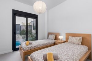 Moderno semi-adosado situado en una zona tranquila de San Fulgencio, en una parcela con piscina privada y espacio exterior destinado al descanso. La vivienda ha sido diseñada para que el jardín sea una prolongación natural de la zona de día, y sus grandes ventanales aportan abundante luz natural, creando espacios luminosos, amplios y abiertos al entorno. La propiedad se distribuye en dos plantas. La planta baja cuenta con un amplio salón con cocina abierta, con acceso directo al jardín. En este nivel se encuentran también dos dormitorios independientes, un baño con acceso desde el pasillo y un cuarto auxiliar independiente destinado a lavandería y almacenamiento adicional. La primera planta constituye la zona privada de los propietarios, con un dormitorio principal que dispone de baño en suite y salida a una amplia y soleada terraza, ideal para el descanso diario. La vivienda fue construida en 2022, ofreciendo un estándar moderno y una distribución funcional. La ubicación combina comodidad para la vida diaria con cercanía a la naturaleza: la propiedad se encuentra a aproximadamente 5 km de la playa y a unos 30 km del Aeropuerto de Alicante-Elche. En las inmediaciones hay dunas naturales, amplias playas de arena y un entorno residencial tranquilo. Se trata de una excelente opción tanto para quienes buscan una vivienda habitual como para inversores, ya que su distribución funcional, arquitectura contemporánea y buena ubicación la convierten en una propiedad atractiva en ambos casos.