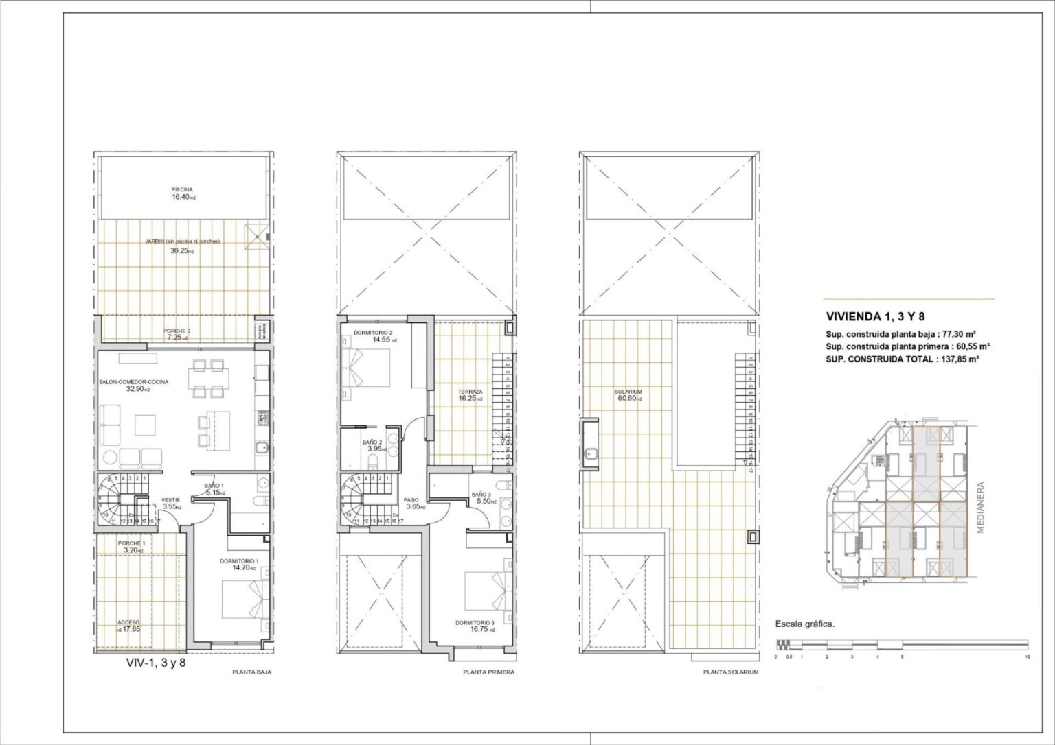 Adosados de Obra Nueva en San Javier – Diseño Moderno y Ubicación Privilegiada Viviendas de Diseño Contemporáneo con Piscina Privada Descubra este exclusivo complejo de 9 adosados de obra nueva en San Javier, Murcia, diseñados para ofrecer el máximo confort y un estilo de vida moderno. Cada vivienda cuenta con piscina privada, terraza, solárium y plaza de aparcamiento, brindando un espacio ideal para el relax y el disfrute durante todo el año. Las viviendas han sido construidas con materiales de alta calidad y un diseño diáfano que aprovecha la luz natural al máximo. Son perfectas tanto para una residencia habitual como para una casa de vacaciones en la Costa Cálida. Distribución y Equipamiento de Alta Calidad Cada adosado dispone de: 3 dormitorios amplios con armarios empotrados y cajoneras. 3 baños completamente equipados con muebles, espejos y mamparas. Cocina de concepto abierto, completamente amueblada y con electrodomésticos incluidos. Salón-comedor espacioso, con grandes ventanales que conectan con la terraza. Piscina privada con ducha y jardín con césped artificial. Solárium con cocina de verano, perfecto para disfrutar del clima mediterráneo. Preinstalación de aire acondicionado por conductos en cada planta. Carpintería exterior de PVC con cristales dobles, garantizando aislamiento térmico y acústico. Puerta de entrada de seguridad, para mayor tranquilidad y protección. Ubicación Estratégica en San Javier San Javier es una localidad costera con una gran oferta de servicios, instalaciones deportivas y zonas de ocio. La ubicación de este residencial permite un acceso rápido a: Playas del Mar Menor – A solo 5 minutos en coche. Playas del Mar Mediterráneo – A 10 minutos. Campos de Golf – Diversas opciones en la zona, ideales para los amantes del golf. Centros Comerciales y servicios – Todo lo que necesita a pocos minutos. Aeropuerto de Murcia-Corvera – A 30 minutos. Aeropuerto de Alicante – A 45 minutos. Disfrute del Mejor Clima y Calidad de Vida en San Javier San Javier es una excelente opción para quienes buscan una propiedad cerca del mar, con un clima privilegiado y acceso a todo tipo de actividades al aire libre. No pierda la oportunidad de adquirir una de estas exclusivas viviendas. Contáctenos hoy mismo para más información o para programar una visita.