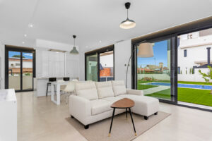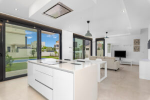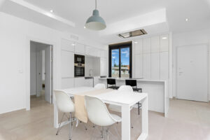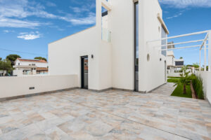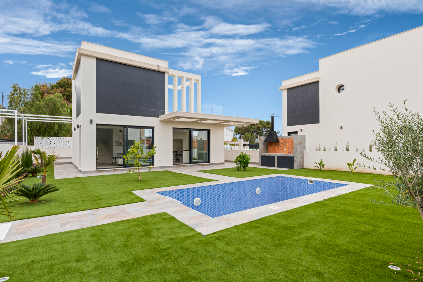 Spektakularna willa w nowoczesnym stylu w El Campello Nieruchomość rozłożona jest na trzech poziomach i oferuje 4 sypialnie oraz 4 łazienki na przestronnej działce o powierzchni 485 metrów kwadratowych, zaledwie 10 minut spacerem od plaży Muchavista. Na parterze znajduje się przestronny salon z jadalnią oraz otwarta i w pełni wyposażona kuchnia. Ta przestrzeń płynnie łączy się z tarasem słonecznym przez duże okna, zalewając dom naturalnym światłem i tworząc ciepłą, przyjazną atmosferę. Dodatkowo na tym piętrze znajdziesz dwie sypialnie z kompletną łazienką i wbudowanymi szafami. Na górnym piętrze znajduje się sypialnia główna – prawdziwa przystań spokoju z własną pełną łazienką i przestronnym, jasnym tarasem o powierzchni 57 metrów kwadratowych. W piwnicy odkryj kolejną sypialnię z pełną łazienką, z dostępem na angielskie patio. Dodatkowo jest garaż z miejscem na dwa pojazdy. Dom wyposażony jest w kompletny system automatyki domowej: otwieranie i zamykanie domu, oświetlenie, rolety, kontrolę oczyszczania basenu i inne (w tym sterowanie ekranem dotykowym). Obejmuje także kompletną instalację klimatyzacji kanałowej (gorąco-zimno). Dom posiada prywatny basen, strefę do grillowania oraz zadaszony taras z dużą ilością miejsca do siedzenia.