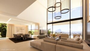 Luksusowa willa z widokiem na morze w Calpe – nowoczesna elegancja z oszałamiającymi widokami Idealna lokalizacja w Calpe, Alicante – Cicha i ugruntowana okolica Ta luksusowa willa znajduje się w Calpe, Alicante, w spokojnej i ugruntowanej dzielnicy znanej ze swojego uroku i bliskości niektórych z najlepszych atrakcji okolicy. Zaledwie 5,4 km od serca Calpe, ta willa oferuje wygodny dostęp do centrum miasta oraz zachwycających plaż Calpe, które mogą się poszczycić krystalicznie czystą wodą i miękkim piaskiem. Znane ze swojego malowniczego piękna, Calpe otoczone jest parkami przyrody oraz ikonicznym Peñón de Ifach, symbolem, który nadaje krajobrazowi wyjątkowy charakter. Miejsca warte odwiedzenia: Calpe Center i plaże: Zaledwie 5,4 km stąd, co umożliwia łatwy dostęp do lokalnych sklepów, restauracji i plaż. Lotnisko Alicante: 78 km, co ułatwia podróże międzynarodowe i krajowe. Pola golfowe: W promieniu 15 km znajduje się kilka znanych pól golfowych, idealnych dla miłośników golfa. Centra handlowe: Popularne centrum handlowe La Marina w Benidorm znajduje się około 25 km stąd, oferując różnorodne opcje zakupów i restauracji. Port Calpe: Około 6 km stąd, idealny dla miłośników jachtów i sportów wodnych. Olśniewająca willa z widokiem na morze, 3 piętra nowoczesnego komfortu. Ta willa oferuje 335 m² luksusowej przestrzeni mieszkalnej na przestronnej działce o powierzchni 1 042 m², z spektakularnymi widokami na morze, Peñón de Ifach oraz miasto Calpe. Dzięki trzem starannie zaprojektowanym piętrom połączonym wewnętrznymi schodami i windą, ta willa oferuje styl i wygodę na każdym poziomie. Półpiwniczny poziom: parking, pralnia i piwnica na wino Wchodząc od ulicy przez automatyczne bramy, docierasz bezpośrednio do wejścia do garażu, znajdującego się na półpiwnicy. Przestronny garaż o powierzchni 52 m² mieści kilka pojazdów, a także specjalną pralnię oraz piwnicę na wino, co dodaje luksusu i praktyczności. Główne piętro: Otwarta przestrzeń mieszkalna i dostęp przy basenie Na parterze, do którego można się dostać schodami lub windą, znajduje się przestronna część dzienna i jadalna prowadząca do ganku o powierzchni 25 m² oraz imponującego tarasu przy basenie o powierzchni 78 m². Otwarta kuchnia, w pełni wyposażona w sprzęt Siemens, doskonale wtapia się w przestrzeń dzienną. Na tym piętrze znajdują się także dwie sypialnie z łazienkami własnymi oraz łazienka gościnna. Górne piętro: Prywatne sypialnie z oszałamiającymi tarasami Na najwyższym piętrze znajdują się dwie dodatkowe sypialnie dwuosobowe, każda z łazienkami i dostępem do otwartych tarasów oferujących panoramiczne widoki. Wysokiej jakości wykończenia i nowoczesne udogodnienia Ta willa może się pochwalić najwyższej klasą wyposażeniem, w tym stolarką technicznym z szybami ochronnymi, oświetleniem LED, ogrzewaniem podłogowym, klimatyzacją kanałową oraz systemem aerotermalnym do podgrzewania wody i ogrzewania. Dodatkowe udogodnienia obejmują elektryczne rolety, wbudowane szafy, systemy alarmowe wewnątrz i na zewnątrz, kamery bezpieczeństwa w premontażu oraz basen o wymiarach 10x3,3 m z miejscem do grillowania. Zwrócona na południe, co zapewnia optymalną ekspozycję na słońce, ta willa jest energooszczędna i ma ocenę A. Doświadczyj życia w luksusie i spokoju w Calpe 291